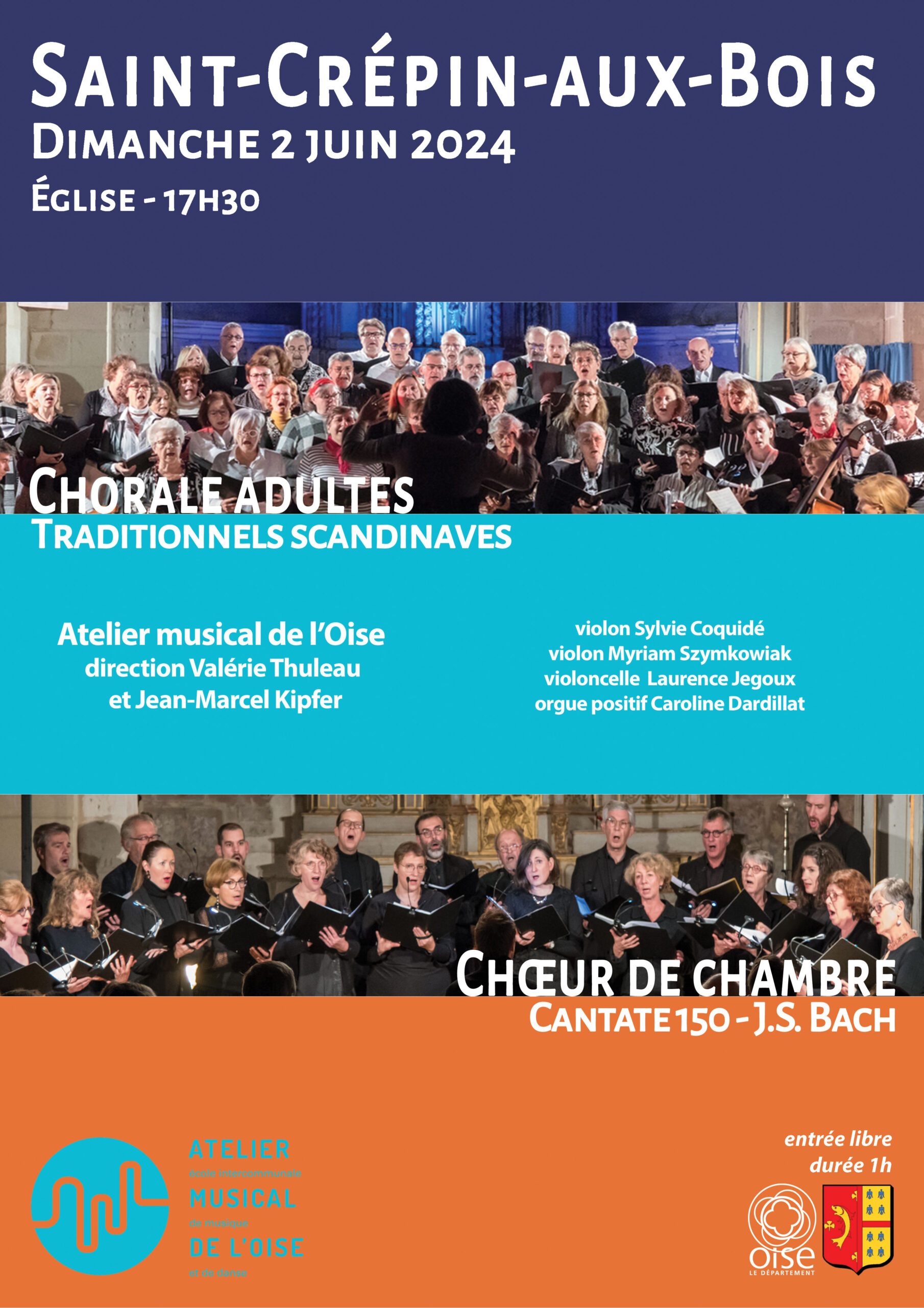 Dimanche 2 juin 2024 17h30 Église de Saint-Crépin-aux-Bois Concert des chœurs de l’Atelier musical de l’Oise Chorale adultes : chants traditionnels scandinaves & Chœur de chambre : Nach dir, Herr, verlanget mich – Cantate BWV 150 de JS Bach entrée libre 0